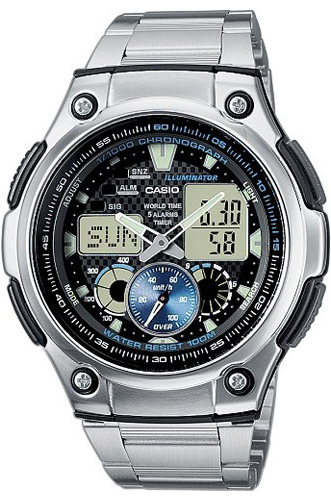 Кварцевые мужские наручные часы Casio AQ-190WD-1A с цифровой+стрелочной индикацией времени. Калибр механизма — 5082. Функциональность данной модели: формат времени 12/24, функция летнего времени (DST), мировое время 48 городов (29 часовых поясов), автоматический календарь до 2099 года, будильник, сигнал начала часа, секундомер с точностью 1/100 секунды и измерением до 99 часов 59 минут 59,99 cек., ввод расстояния и расчет скорости перемещения, таймер обратного отсчета (диапазон времени 24 часа), диодная подсветка циферблата и люминесцентное напыление на стрелках и метках часов. Водонепроницаемость WR100 (10 атм).