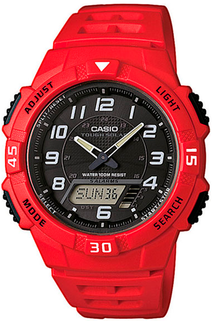 Кварцевые мужские наручные часы на солнечной батарее Casio AQ-S800W-4B с цифровой+стрелочной индикацией времени. Калибр механизма — 5208. Функциональность данной модели: режим сохранения энергии, индикатор заряда батареи, формат времени 12/24, функция летнего времени (DST), мировое время 48 городов (31 часовой пояс), автоматический календарь до 2099 года, 5 независимых будильников, сигнал начала часа, секундомер с точностью 1/100 секунды и измерением до 59 минут 59,99 cек., 2 независимых таймера обратного отсчета (диапазон времени 99 минут 55 сек.), функция выключения звука кнопок (Mute), диодная подсветка циферблата и люминесцентное напыление на стрелках и метках часов. Водонепроницаемость WR100 (10 атм). Размеры корпуса: Диаметр 45 мм; толщина 11.6 мм Гарантийный срок — 3 года (1 год от производителя + 2 года от магазина).