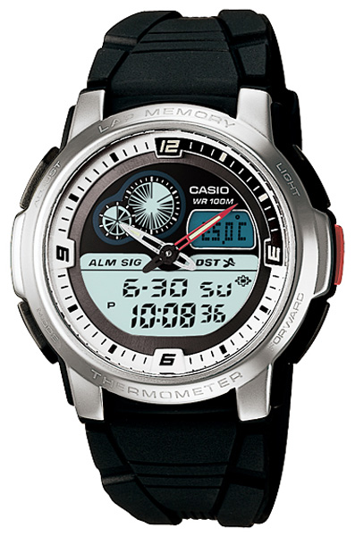 Кварцевые мужские наручные часы Casio AQF-102W-7B с цифровой+стрелочной индикацией времени. Калибр механизма — 4738. Функциональность данной модели: формат времени 12/24, функция летнего времени (DST), мировое время 50 городов (30 часовых поясов), автоматический календарь до 2099 года, будильник, сигнал начала часа, секундомер с точностью 1/100 секунды и измерением до 99 часов 59 минут 59,99 cек., таймер обратного отсчета (диапазон времени 100 часов), функция выключения звука кнопок (Mute), термометр, электролюминесцентная подсветка циферблата с функцией авто (включается при наклоне часов на 40°) и люминесцентное напыление на стрелках. Водонепроницаемость WR100 (10 атм).