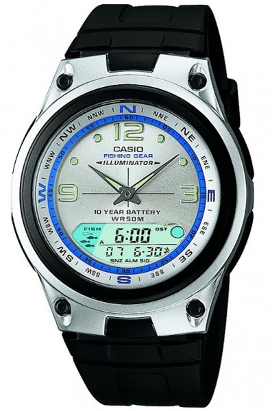 Кварцевые мужские наручные часы для рыбаков Casio AW-82-7A с цифровой+стрелочной индикацией времени. Калибр механизма — 3768. Функциональность данной модели: формат времени 12/24, функция летнего времени (DST), функция двойного времени, автоматический календарь до 2099 года, будильник, сигнал начала часа, секундомер с точностью 1/100 секунды и измерением до 23 часов 59 минут 59,99 cек., таймер обратного отсчета (диапазон времени 24 часа), функция выключения звука кнопок (Mute), фаза/возраст луны, график удачной рыбалки, диодная подсветка циферблата и люминесцентное напыление на стрелках и метках часов. Водонепроницаемость WR50 (5 атм).