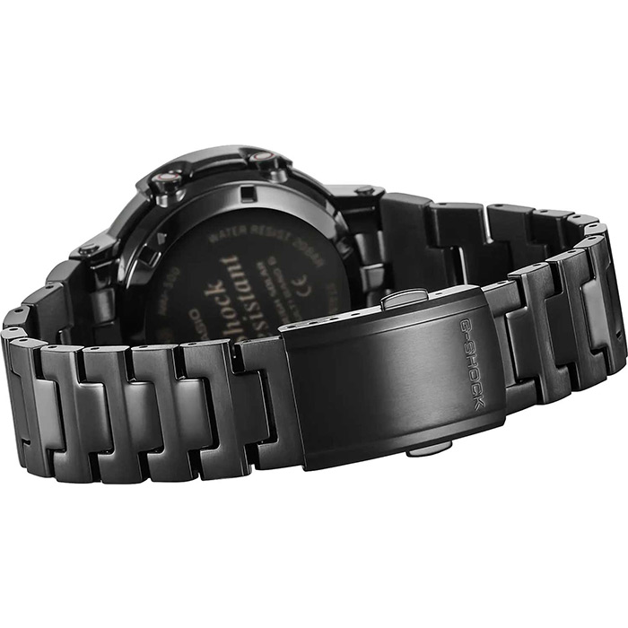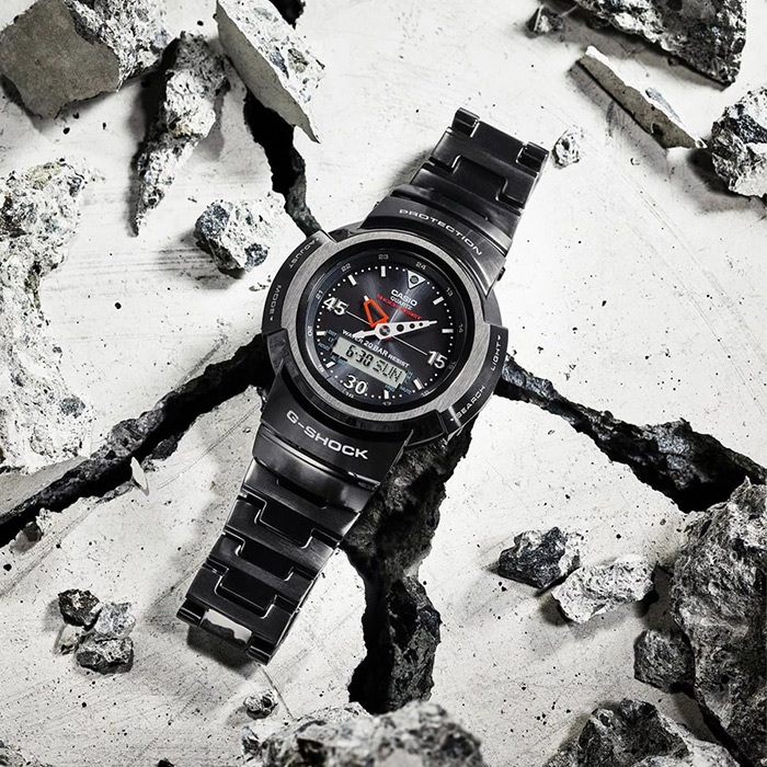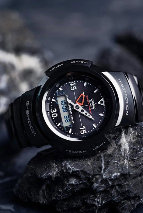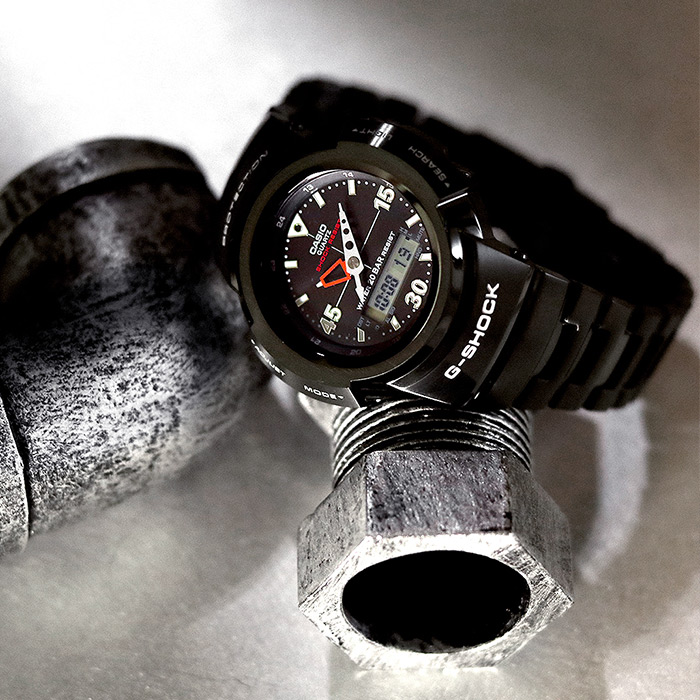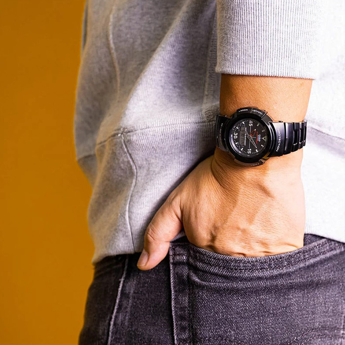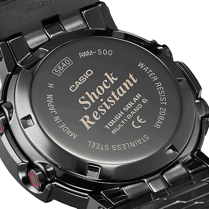 Противоударные кварцевые мужские наручные часы на солнечной батарее Casio AWM-500-1A коллекции G-Shock с цифровой+стрелочной индикацией времени и радиоконтролем точного времени. Калибр механизма — 5640. Аккумулятор данной модели заряжается от любого источника света. Срок работы аккумулятора с полным зарядом — 11 месяцев при обычном использовании без воздействия света после зарядки, 28 месяцев при хранении в полной темноте с включенной функцией энергосбережения после полной зарядки. Примерный срок службы аккумулятора — 10 лет. Функциональность данной модели: радиоконтроль точного времени (Wave Ceptor); формат времени 12/24; автоматический календарь до 2099 года; функция летнего времени (DST); мировое время 48 городов (31 часовой пояс); 5 будильников; сигнал начала часа; секундомер с точностью 1/100 секунды и измерением до 59 минут 59,99 cек.; таймер в диапазоне времени 100 минут с шагом 1 секунда; двойная диодная подсветка циферблата с функцией авто (включается при наклоне часов на 40°) и возможностью выбора продолжительности свечения (1.5 или 3 секунды) + необритовое (Neobrite) покрытие на стрелках и метках для длительного послесвечения в темноте; функция выключения звука нажатия кнопок (Mute); индикатор уровня заряда аккумулятора и режим сохранения энергии (стрелки останавливаются для экономии энергии, когда часы остаются в темноте); функция перемещения стрелок (помогает определить значения в окошке с цифровой индикацией, когда стрелки его закрывают). Корпус и браслет изготовлены из нержавеющей стали. На корпус и браслет нанесено стойкое PVD покрытие. Завинчивающаяся задняя крышка. Водонепроницаемость WR200 (20 атм). Размеры корпуса: (ШxВxТ) 44.5x51.8x14.2 мм. Гарантийный срок — 3 года (1 год от производителя + 2 года от магазина).