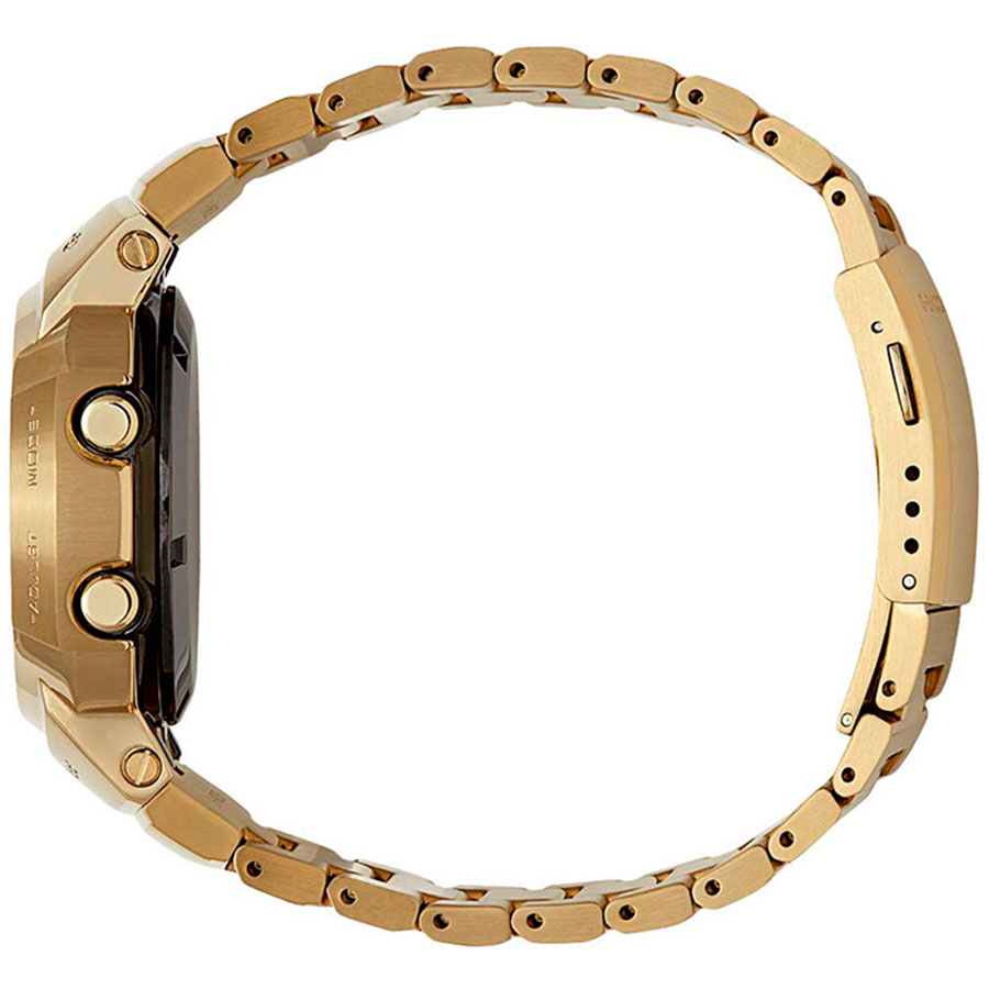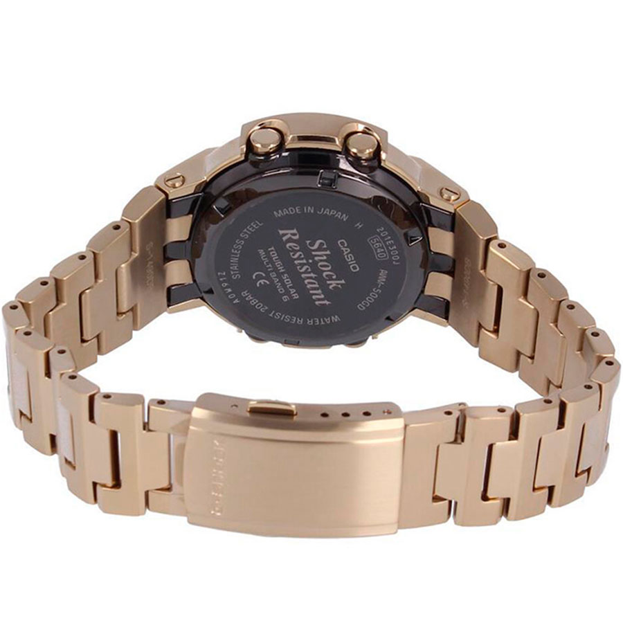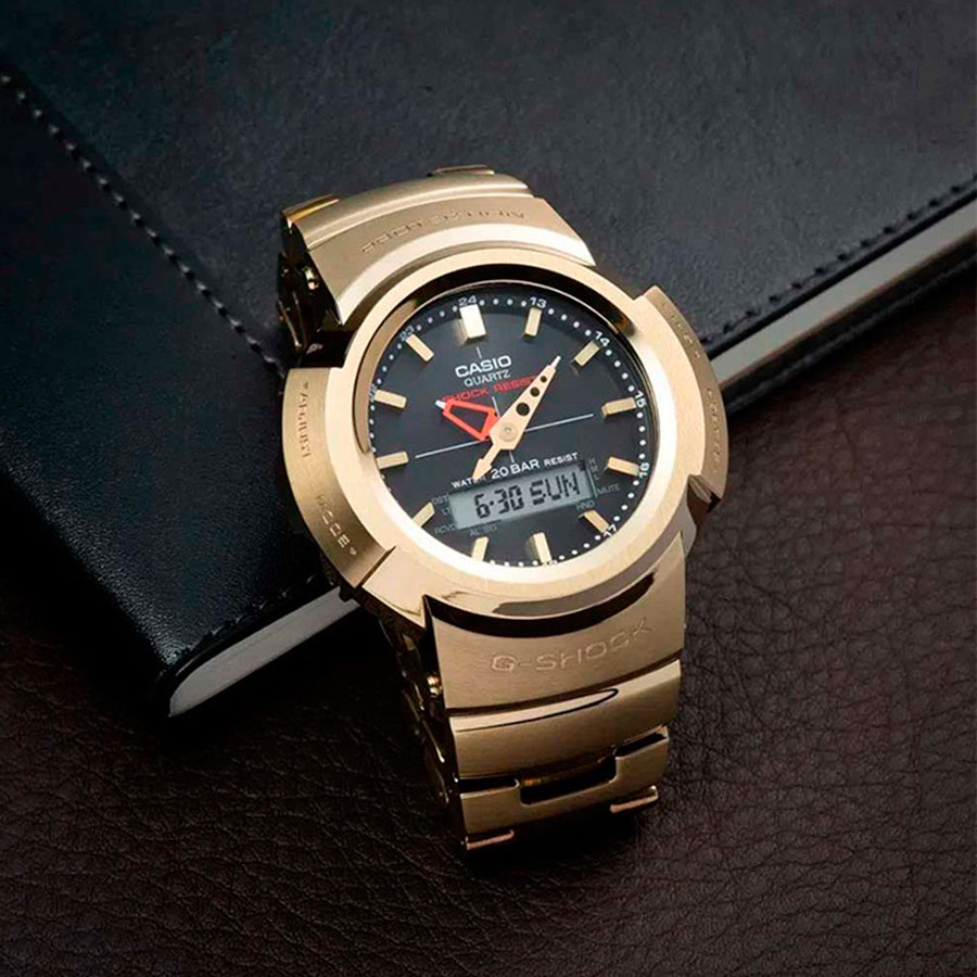 Противоударные кварцевые мужские наручные часы на солнечной батарее Casio AWM-500GD-9A коллекции G-Shock с цифровой+стрелочной индикацией времени и радиоконтролем точного времени. Калибр механизма — 5640. Аккумулятор данной модели заряжается от любого источника света. Срок работы аккумулятора с полным зарядом — 11 месяцев при обычном использовании без воздействия света после зарядки, 28 месяцев при хранении в полной темноте с включенной функцией энергосбережения после полной зарядки. Примерный срок службы аккумулятора — 10 лет. Функциональность данной модели: радиоконтроль точного времени (Wave Ceptor); формат времени 12/24; автоматический календарь до 2099 года; функция летнего времени (DST); мировое время 48 городов (31 часовой пояс); 5 будильников; сигнал начала часа; секундомер с точностью 1/100 секунды и измерением до 59 минут 59,99 cек.; таймер в диапазоне времени 100 минут с шагом 1 секунда; двойная диодная подсветка циферблата с функцией авто (включается при наклоне часов на 40°) и возможностью выбора продолжительности свечения (1.5 или 3 секунды) + необритовое (Neobrite) покрытие на стрелках для длительного послесвечения в темноте; функция выключения звука нажатия кнопок (Mute); индикатор уровня заряда аккумулятора и режим сохранения энергии (стрелки останавливаются для экономии энергии, когда часы остаются в темноте); функция перемещения стрелок (помогает определить значения в окошке с цифровой индикацией, когда стрелки его закрывают). Корпус и браслет изготовлены из нержавеющей стали. На корпус и браслет нанесено стойкое PVD покрытие. Завинчивающаяся задняя крышка. Водонепроницаемость WR200 (20 атм). Размеры корпуса: (ШxВxТ) 44.5x51.8x14.2 мм. Гарантийный срок — 3 года (1 год от производителя + 2 года от магазина).