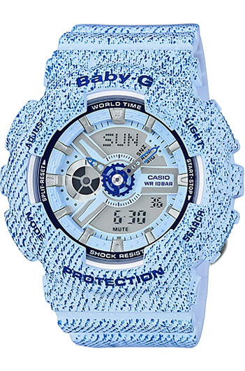 Противоударные кварцевые женские наручные часы Casio BA-110DC-2A3 коллекции Baby-G с двойной индикацией времени. Калибр механизма — 5338. Функциональность данной модели: формат времени 12/24, мировое время 48 городов (29 часовых поясов), автоматический календарь до 2099 года, функция летнего времени (DST), 5 независимых будильников, сигнал начала часа, секундомер с точностью 1/100 секунды и измерением до 23 часов 59 минут 59,99 cек., таймер обратного отсчета (диапазон времени 24 часа), диодная подсветка циферблата. Водонепроницаемость WR100 (10 атм).