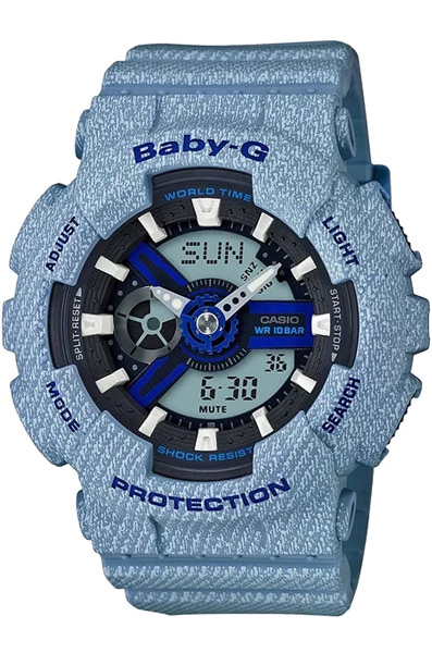 Противоударные кварцевые женские наручные часы Casio BA-110DE-2A2 коллекции Baby-G с двойной индикацией времени. Калибр механизма — 5338. Функциональность данной модели: формат времени 12/24, мировое время 48 городов (29 часовых поясов), автоматический календарь до 2099 года, функция летнего времени (DST), 5 независимых будильников, сигнал начала часа, секундомер с точностью 1/100 секунды и измерением до 23 часов 59 минут 59,99 cек., таймер обратного отсчета (диапазон времени 24 часа), диодная подсветка циферблата. Водонепроницаемость WR100 (10 атм).