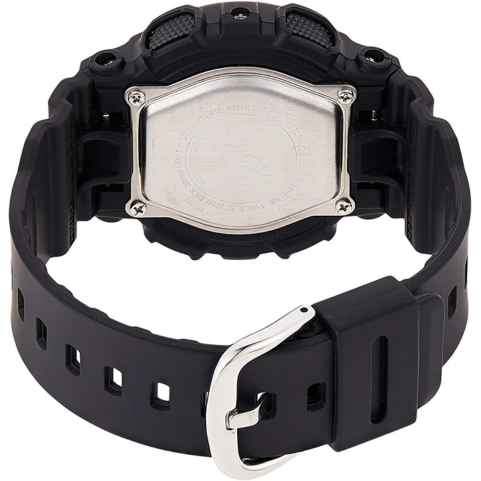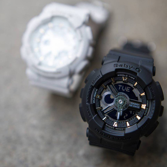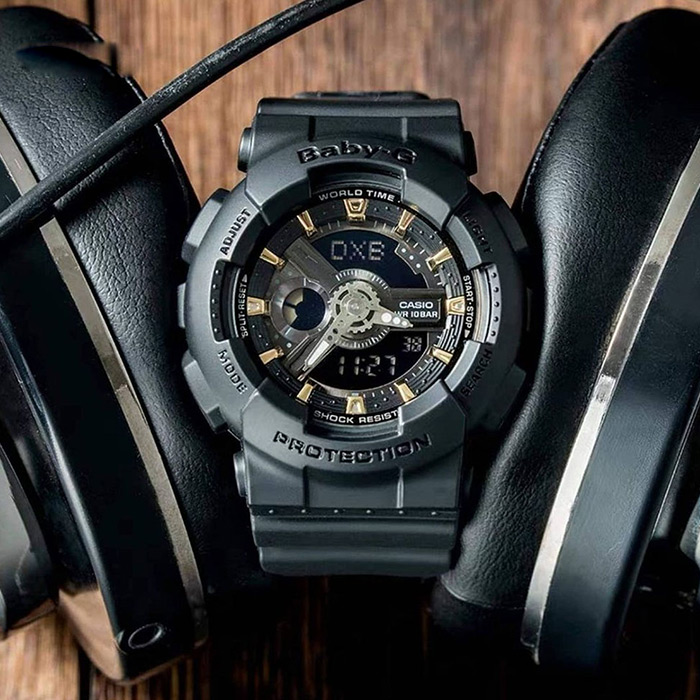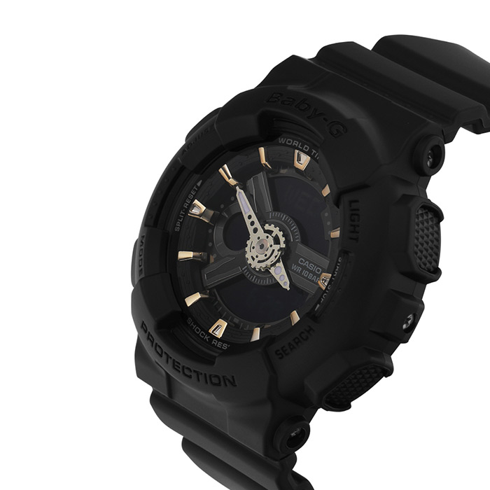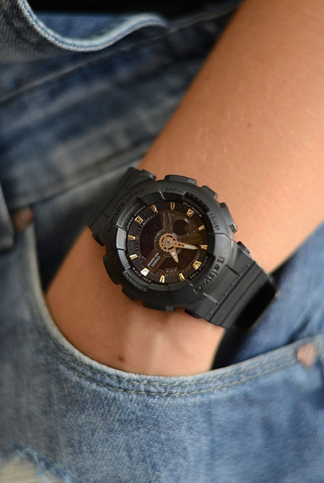 Противоударные кварцевые женские наручные часы Casio BA-110GA-1A коллекции Baby-G с двойной индикацией времени. Калибр механизма — 5338. Функциональность данной модели: формат времени 12/24, мировое время 48 городов (29 часовых поясов), автоматический календарь до 2099 года, функция летнего времени (DST), 5 независимых будильников, сигнал начала часа, секундомер с точностью 1/100 секунды и измерением до 23 часов 59 минут 59,99 cек., таймер обратного отсчета (диапазон времени 24 часа), диодная подсветка циферблата с функцией послесвечения, функция выключения звука нажатия кнопок (Mute). Стрелки покрыты необритовым (Neobrite) люминесцентным напылением (светятся в темноте). Водонепроницаемость WR100 (10 атм). Размеры корпуса: (ШхВхТ) 43.4x46.3x15.8 мм Гарантийный срок — 3 года (1 год от производителя + 2 года от магазина).