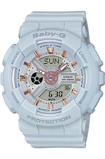 Противоударные кварцевые женские наручные часы Casio BA-110GA-8A коллекции Baby-G с двойной индикацией времени. Калибр механизма — 5338. Функциональность данной модели: формат времени 12/24, мировое время 48 городов (29 часовых поясов), автоматический календарь до 2099 года, функция летнего времени (DST), 5 независимых будильников, сигнал начала часа, секундомер с точностью 1/100 секунды и измерением до 23 часов 59 минут 59,99 cек., таймер обратного отсчета (диапазон времени 24 часа), диодная подсветка циферблата. Водонепроницаемость WR100 (10 атм).