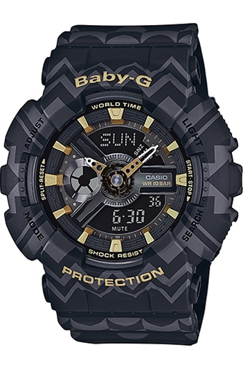 Противоударные кварцевые женские наручные часы Casio BA-110TP-1A коллекции Baby-G с двойной индикацией времени. Калибр механизма — 5338. Функциональность данной модели: формат времени 12/24, мировое время 48 городов (29 часовых поясов), автоматический календарь до 2099 года, функция летнего времени (DST), 5 независимых будильников, сигнал начала часа, секундомер с точностью 1/100 секунды и измерением до 23 часов 59 минут 59,99 cек., таймер обратного отсчета (диапазон времени 24 часа), диодная подсветка циферблата. Водонепроницаемость WR100 (10 атм).