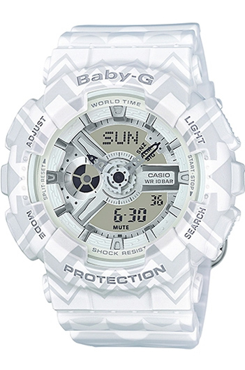 Противоударные кварцевые женские наручные часы Casio BA-110TP-7A коллекции Baby-G с двойной индикацией времени. Калибр механизма — 5338. Функциональность данной модели: формат времени 12/24, мировое время 48 городов (29 часовых поясов), автоматический календарь до 2099 года, функция летнего времени (DST), 5 независимых будильников, сигнал начала часа, секундомер с точностью 1/100 секунды и измерением до 23 часов 59 минут 59,99 cек., таймер обратного отсчета (диапазон времени 24 часа), диодная подсветка циферблата. Водонепроницаемость WR100 (10 атм).