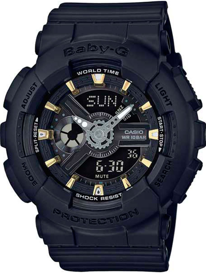 Противоударные кварцевые женские наручные часы Casio BA-110XGA-1A коллекции Baby-G с двойной индикацией времени. Калибр механизма — 5338. Функциональность данной модели: формат времени 12/24, мировое время 48 городов (29 часовых поясов), автоматический календарь до 2099 года, функция летнего времени (DST), 5 независимых будильников, сигнал начала часа, секундомер с точностью 1/100 секунды и измерением до 23 часов 59 минут 59,99 cек., таймер обратного отсчета (диапазон времени 24 часа), диодная подсветка циферблата с функцией послесвечения, функция выключения звука нажатия кнопок (Mute). Стрелки покрыты необритовым (Neobrite) люминесцентным напылением (светятся в темноте). Водонепроницаемость WR100 (10 атм). Размеры корпуса: (ШхВхТ) 43.4x46.3x15.8 мм Гарантийный срок — 3 года (1 год от производителя + 2 года от магазина).