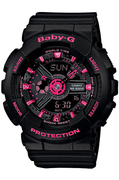 Противоударные кварцевые женские наручные часы Casio BA-111-1A коллекции Baby-G с двойной индикацией времени. Калибр механизма — 5338. Функциональность данной модели: формат времени 12/24, мировое время 48 городов (29 часовых поясов), автоматический календарь до 2099 года, функция летнего времени (DST), 5 независимых будильников, сигнал начала часа, секундомер с точностью 1/100 секунды и измерением до 23 часов 59 минут 59,99 cек., таймер обратного отсчета (диапазон времени 24 часа), диодная подсветка циферблата. Водонепроницаемость WR100 (10 атм).