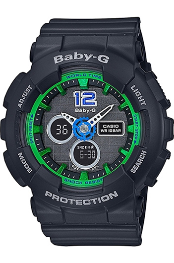 Противоударные кварцевые женские наручные часы Casio BA-120-1B коллекции Baby-G с двойной индикацией времени. Калибр механизма — 5457. Функциональность данной модели: формат времени 12/24, мировое время 27 городов (29 часовых поясов), автоматический календарь до 2039 года, функция летнего времени (DST), 5 независимых будильников, сигнал начала часа, секундомер с точностью 1/100 секунды и измерением до 59 минут 59,99 cек., таймер обратного отсчета (диапазон времени 60 минут), диодная подсветка циферблата. Водонепроницаемость WR100 (10 атм).
