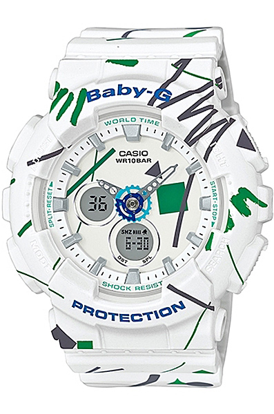 Противоударные кварцевые женские наручные часы Casio BA-120SC-7A коллекции Baby-G с двойной индикацией времени. Калибр механизма — 5457. Функциональность данной модели: формат времени 12/24, мировое время 27 городов (29 часовых поясов), автоматический календарь до 2039 года, функция летнего времени (DST), 5 независимых будильников, сигнал начала часа, секундомер с точностью 1/100 секунды и измерением до 59 минут 59,99 cек., таймер обратного отсчета (диапазон времени 60 минут), диодная подсветка циферблата. Водонепроницаемость WR100 (10 атм).