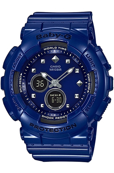Противоударные кварцевые женские наручные часы Casio BA-125-2A коллекции Baby-G с двойной индикацией времени. Калибр механизма — 5457. Функциональность данной модели: формат времени 12/24, мировое время 27 городов (29 часовых поясов), автоматический календарь до 2039 года, функция летнего времени (DST), 5 независимых будильников, сигнал начала часа, секундомер с точностью 1/100 секунды и измерением до 59 минут 59,99 cек., таймер обратного отсчета (диапазон времени 60 минут), диодная подсветка циферблата. Водонепроницаемость WR100 (10 атм).