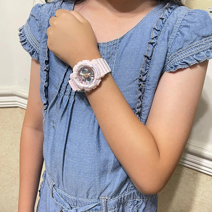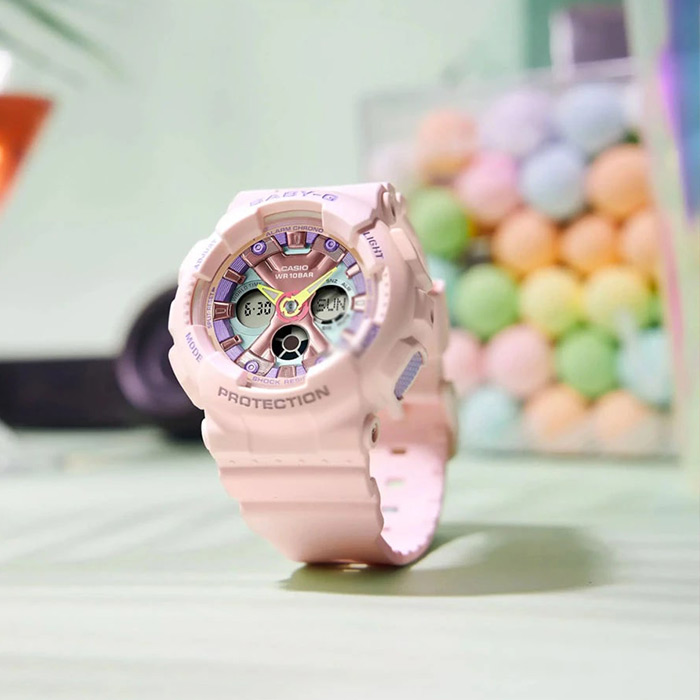 Противоударные кварцевые женские наручные часы Casio BA-130PM-4A коллекции Baby-G с двойной индикацией времени. Калибр механизма — 5607. Функциональность данной модели: формат времени 12/24, мировое время 48 городов (29 часовых поясов), автоматический календарь до 2099 года, функция летнего времени (DST), 5 независимых будильников, сигнал начала часа, секундомер с точностью 1/100 секунды и измерением до 23 часов 59 минут 59,99 cек., таймер обратного отсчета (диапазон времени 24 часа), диодная подсветка циферблата с функцией послесвечения, функция выключения звука нажатия кнопок (Mute). Стрелки покрыты необритовым (Neobrite) люминесцентным напылением (светятся в темноте). Водонепроницаемость WR100 (10 атм). Размеры корпуса: (ШхВхТ) 43.3x46.3x15.8 мм Гарантийный срок — 3 года (1 год от производителя + 2 года от магазина).