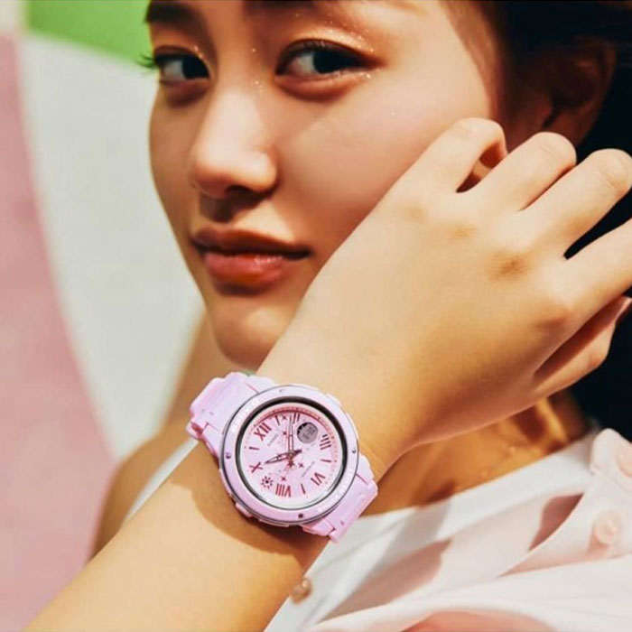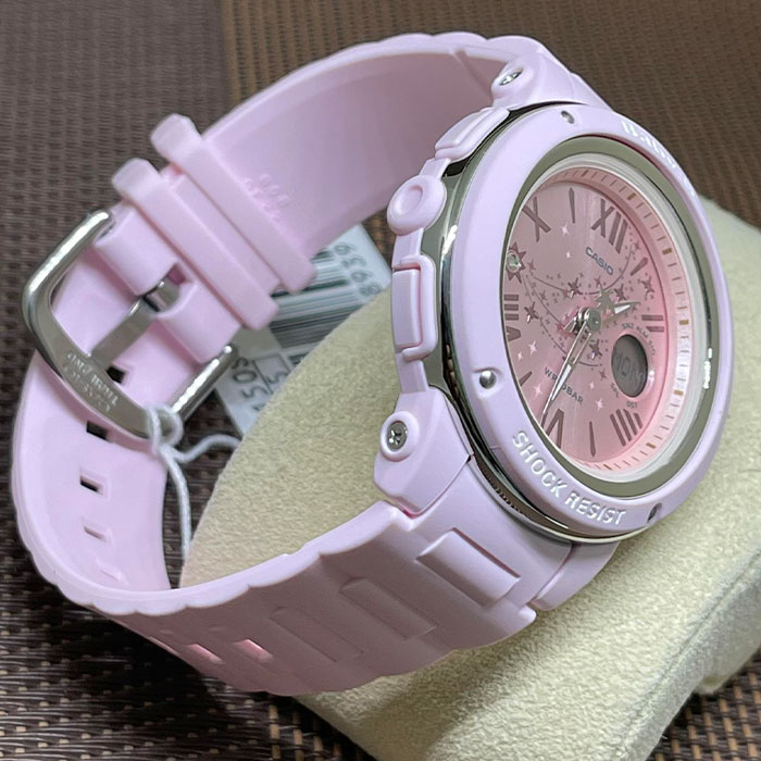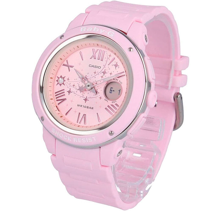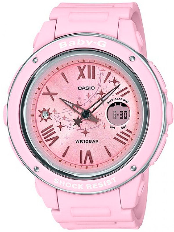 Противоударные кварцевые женские наручные часы Casio BGA-150ST-4A коллекции Baby-G с двойной индикацией времени. Калибр механизма — 5595. Функциональность данной модели: формат времени 12/24, мировое время 27 городов (29 часовых поясов), автоматический календарь до 2099 года, функция летнего времени (DST), 5 независимых будильников, сигнал начала часа, секундомер с точностью 1/100 секунды и измерением до 59 минут 59,99 cек., таймер обратного отсчета (диапазон времени 60 минут), диодная подсветка циферблата с возможностью выбора времени свечения (1.5 или 3 секунды) + необритовое (Neobrite) покрытие на стрелках для длительного послесвечения в темноте. Корпус из нержавеющей стали и пластика. Циферблат украшен кристаллом. Водонепроницаемость WR100 (10 атм). Размеры корпуса: (ШxВxТ) 42.8x47.5x12.8 мм. Гарантийный срок — 3 года (1 год от производителя + 2 года от магазина).