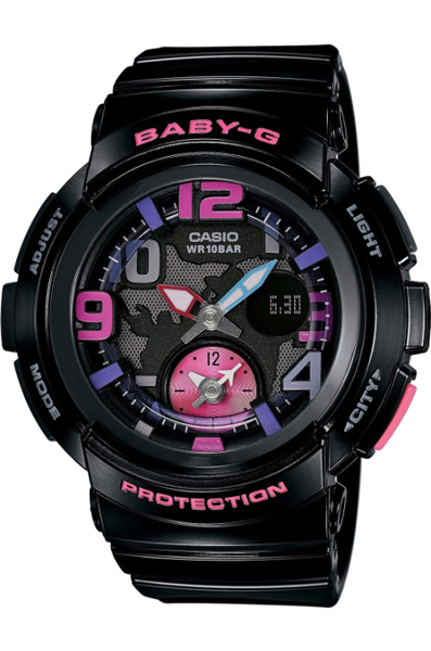 Противоударные кварцевые женские наручные часы Casio BGA-190-1B коллекции Baby-G с двойной индикацией времени. Калибр механизма — 5382. Функциональность данной модели: формат времени 12/24, мировое время 48 городов (31 часовой пояс), автоматический календарь до 2099 года, функция летнего времени (DST), будильник, сигнал начала часа, секундомер с измерением до 59 минут 59 cек., таймер обратного отсчета (диапазон времени 60 минут), диодная подсветка циферблата, режим выключения звука нажатия кнопок (Mute). Водонепроницаемость WR100 (10 атм).