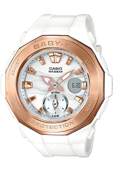 Противоударные кварцевые женские наручные часы Casio BGA-220G-7A коллекции Baby-G с двойной индикацией времени. Калибр механизма — 5482. Функциональность данной модели: формат времени 12/24, мировое время 48 городов (31 часовой пояс), автоматический календарь до 2099 года, функция летнего времени (DST), будильник, сигнал начала часа, секундомер с измерением до 59 минут 59,99 cек., таймер обратного отсчета (диапазон времени 60 минут), индикатор возраста Луны для конкретной даты, данные приливов для конкретной даты и времени, термометр, диодная подсветка циферблата. Водонепроницаемость WR100 (10 атм).