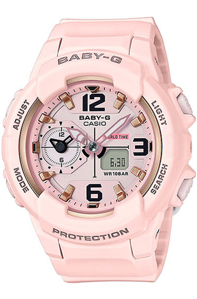 Противоударные кварцевые женские наручные часы Casio BGA-230SC-4B коллекции Baby-G с двойной индикацией времени. Калибр механизма — 5508. Функциональность данной модели: формат времени 12/24, мировое время 48 городов (31 часовой пояс), автоматический календарь до 2099 года, функция летнего времени (DST), будильник, сигнал начала часа, секундомер с измерением до 59 минут 59 cек., таймер обратного отсчета (диапазон времени 60 минут), диодная подсветка циферблата, режим выключения звука нажатия кнопок (Mute). Функция сдвига стрелок в нейтральное положение для удобства обзора цифровой индикации. Водонепроницаемость WR100 (10 атм).