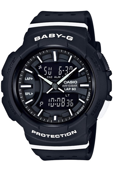 Противоударные кварцевые женские наручные часы Casio BGA-240-1A1 коллекции Baby-G с двойной индикацией времени. Калибр механизма — 5510. Функциональность данной модели: формат времени 12/24, двойное время, автоматический календарь до 2099 года, функция летнего времени (DST), 3 многофункциональных будильника, сигнал начала часа, секундомер с измерением до 99 часов 59 минут 59 cек. и фиксированием результатов на 60 записей, таймер обратного отсчета (диапазон времени 24 часа), диодная подсветка циферблата с выбором продолжительности подсветки 1,5 или 3 секунды, режим выключения звука нажатия кнопок (Mute). Водонепроницаемость WR100 (10 атм).