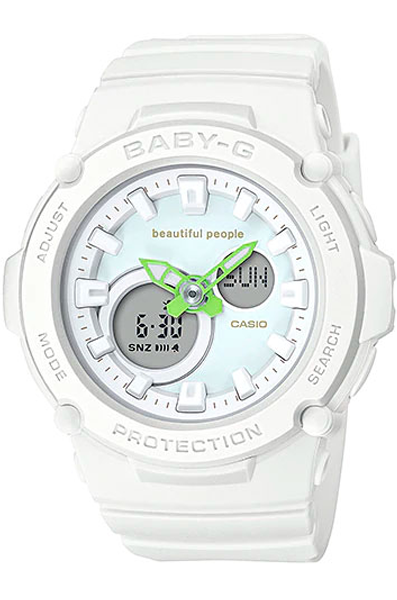 Противоударные кварцевые женские наручные часы Casio BGA-270BP-7A коллекции Baby-G с двойной индикацией времени. Калибр механизма — 5629. Функциональность данной модели: формат времени 12/24, функция мирового времени, автоматический календарь до 2099 года, функция летнего времени (DST), 5 будильников, сигнал начала часа, секундомер с измерением до 59 минут 59 cек., таймер обратного отсчета (диапазон времени 1 час), диодная подсветка циферблата. Водонепроницаемость WR100 (10 атм). Размеры корпуса: (ШxВxТ) 43.2x46.3x13.2 мм. Гарантийный срок — 3 года (1 год от производителя + 2 года от магазина).