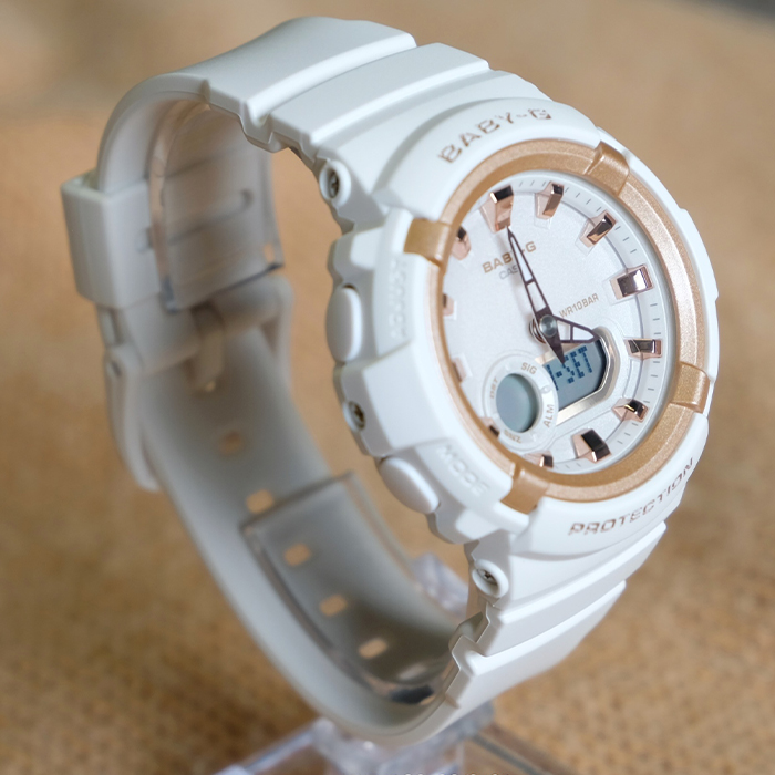 Противоударные кварцевые женские наручные часы Casio BGA-280BA-7A коллекции Baby-G с двойной индикацией времени. Калибр механизма — 5662. Функциональность данной модели: формат времени 12/24, мировое время 27 городов (29 часовых поясов), автоматический календарь до 2039 года, функция летнего времени (DST), 5 независимых будильников, сигнал начала часа, секундомер с точностью 1 секунда и измерением до 1 часа, таймер обратного отсчета (диапазон времени 60 минут) с шагом 1 сек., диодная подсветка циферблата с возможностью выбора времени свечения (1.5 или 3 секунды). Стрелки покрыты необритовым (Neobrite) люминесцентным напылением (светятся в темноте). Водонепроницаемость WR100 (10 атм). Размеры корпуса: (ШхВхТ) 43.4x47.4x14.8 мм Гарантийный срок — 3 года (1 год от производителя + 2 года от магазина).