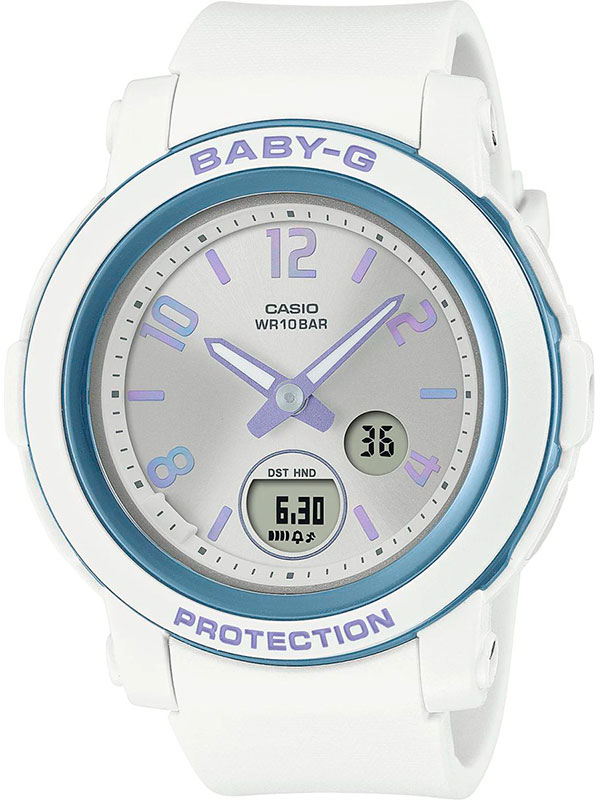 Противоударные кварцевые женские наручные часы Casio BGA-290DR-7A коллекции Baby-G с двойной индикацией времени. Калибр механизма — 5670. Функциональность данной модели: формат времени 12/24, мировое время в 48 городах (в 31 часовом поясе), автоматический календарь до 2099 года, функция летнего времени (DST), 5 будильников, сигнал начала часа, секундомер с шагом 1/100 секунды и измерением до 59 минут 59 cек., таймер обратного отсчета (диапазон времени 24 часа), двойная диодная подсветка циферблата с возможность выбора времени свечения (1.5 или 3 секунды), функция выключения звука нажатия кнопок. Стрелки покрыты необритовым (Neobrite) люминесцентным напылением (светятся в темноте). Функция ручного перемещения стрелок (стрелки перемещаются в сторону, чтобы обеспечить беспрепятственный просмотр содержимого цифрового дисплея). Водонепроницаемость WR100 (10 атм). Размеры корпуса: (ШxВxТ) 41.5x45.2x10.1 мм. Гарантийный срок — 3 года (1 год от производителя + 2 года от магазина).