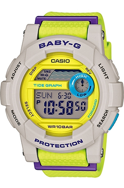 Противоударные кварцевые женские наручные часы Casio BGD-180-3E коллекции Baby-G с цифровой индикацией времени. Калибр механизма — 3429. Функциональность данной модели: формат времени 12/24, мировое время 48 городов (29 часовых поясов), автоматический календарь до 2099 года, функция летнего времени (DST), 3 многофункциональных будильника, сигнал начала часа, секундомер с измерением до 23 часов 59 минут 59,99 cек., таймер обратного отсчета (диапазон времени 24 часа), индикатор возраста Луны, график приливов, электролюминесцентная подсветка циферблата, возможность отключения звук кнопок (Mute). Водонепроницаемость WR100 (10 атм).
