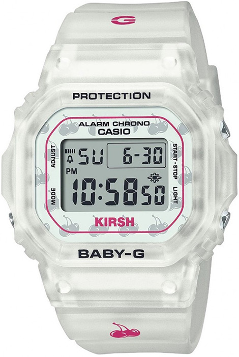 Противоударные кварцевые женские наручные часы Casio BGD-565KRS-7 коллекции Baby-G с цифровой индикацией времени. Выпущено ограниченное количество экземпляров данной модели часов. Данная модель создана совместно со знаменитым корейским брендом уличной моды и косметики — KIRSH. Логотип этого корейского бренда изображен на циферблате, ремешке, задней крышке и даже на дисплее при его подсветке! Оригинальный дизайн упаковки этой серии значительно отличается от других моделей Baby-G. Дополнительный ремешок серого матового полупрозрачного цвета в комплекте. Калибр механизма — 3489. Функциональность данной модели: формат времени 12/24, автоматический календарь до 2099 года, функция летнего времени (DST), будильник, сигнал начала часа, секундомер с точностью 1/100 секунды и измерением до 59 минут 59,99 cек., таймер обратного отсчета (диапазон времени 24 часа), электролюминесцентная подсветка циферблата с функцией послесвечения. Водонепроницаемость WR100 (10 атм). Размеры корпуса: (ШxВxТ) 37.9x42.1x11.3 мм. Гарантийный срок — 3 года (1 год от производителя + 2 года от магазина).