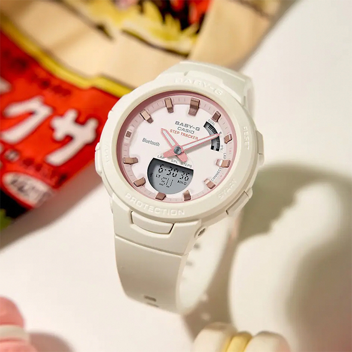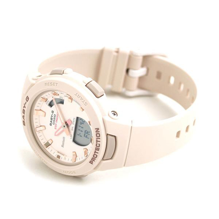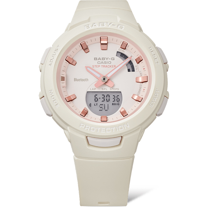 Противоударные кварцевые женские наручные часы Casio BSA-B100CS-7A коллекции Baby-G с функцией шагомера и технологией Bluetooth®. Калибр механизма — 5556. С помощью Bluetooth® вы можете подключить часы к смартфону и с помощью приложения BABY-G Connected получить доступ к полезным функциям. Часы автоматически связываются с телефоном через Bluetooth® и проверяют точность времени 4 раза в сутки. Просмотр количества шагов за 24 часа, интенсивность упражнений и физических нагрузок. Просмотр еженедельного количества шагов и числа сожженных калорий. Просмотр информации секундомера о времени прохождения кругов или промежуточных результатах (до 200 записей). Настройка программируемых таймеров и создание групп из нескольких таймеров. Настройка мирового времени. Функция поиска телефона, можно включить тоновый сигнал на телефоне, что позволит быстро найти телефон. Функциональность данной модели: формат времени 12/24, автоматический календарь до 2099 года, функция летнего времени (DST), функция двойного времени, 5 независимых будильников, сигнал начала часа, секундомер с измерением до 23 часов 59 минут 59 cек. и записью данных (до 200 записей), 5 независимых таймеров обратного отсчета (диапазон времени 60 минут), двойная диодная подсветка циферблата с функцией авто (включается при наклоне часов на 40°) и регулировкой времени подсветки 1,5 или 3 секунды + необритовое (Neobrite) покрытие на стрелках для длительного послесвечения в темноте, режим выключения звука нажатия кнопок (Mute), функция смещения стрелок для удобного просмотра информации на цифровом экране. Подсчет количества шагов с помощью 3-х осевого аксилометра. Напоминание о активности: Информирует Вас о том, что количество шагов слишком мало, с помощью дисплея и звукового сигнала. График количества шагов: почасовое количество шагов за последние 11 часов на 6-уровневом графике Индикатор количества шагов. Режим энергосбережения: Автоматический переход датчика в режим ожидания после фиксированного периода бездействия. Диапазон подсчета и отображения количества шагов: от 0 до 999 999. Водонепроницаемость WR100 (10 атм). Размеры корпуса: (ШxВxТ) 41.4x49.6x12.6 мм. Гарантийный срок — 3 года (1 год от производителя + 2 года от магазина).