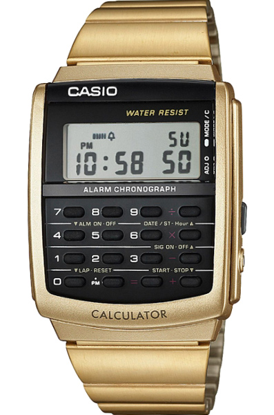 Кварцевые мужские наручные часы с калькулятором Casio CA-506G-9A. Калибр механизма — 437. Функциональность данной модели: калькулятор, формат времени 12/24, автоматический календарь до 2079 года, будильник, сигнал начала часа, секундомер с точностью 1/100 секунды и измерением до 23 часов 59 минут 59,99 cек., функция двойного времени, функция выключения звука кнопок (Mute).