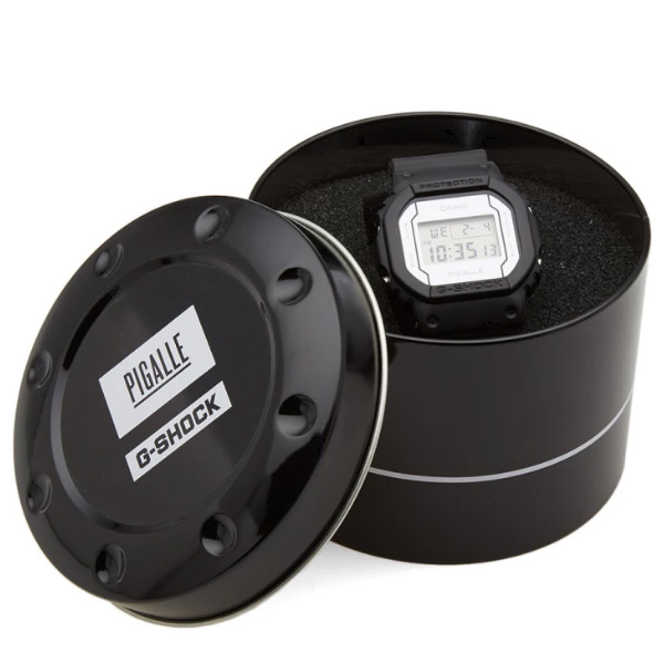 Противоударные кварцевые мужские наручные часы Casio DW-5600PGB-1E коллекции G-Shock с цифровой индикацией времени. Лимитированная серия создана совместно с брендом Pigalle. Калибр механизма — 3229. Функциональность данной модели: формат времени 12/24, автоматический календарь до 2099 года, функция летнего времени (DST), многофункциональный будильник, сигнал начала часа, секундомер с точностью 1/100 секунды (для первых 60 минут), 1 секунда (после 60 минут) и измерением до 23 часов 59 минут 59,99 cек., таймер обратного отсчета (диапазон времени 24 часа), электролюминесцентная подсветка циферблата. Водонепроницаемость WR200 (20 атм).