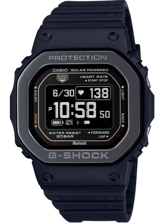 Противоударные кварцевые мужские наручные часы на солнечной батарее Casio DW-H5600MB-1 коллекции G-Shock с цифровой индикацией времени, функцией шагомера и технологией Bluetooth® Smart. Калибр механизма — 3516. Аккумулятор данной модели заряжается от любого источника света + зарядка от любого источника с подключением по USB (тип А). Срок работы аккумулятора при спользовании функций активности (частота сердечных сокращений): приблизительно 35 часов. Использование в режиме часов с выключенным измерением частоты сердечных сокращений: приблизительно 1 месяц, использование с включенной функцией энергосбережения: приблизительно 11 месяцев. Примерный срок службы аккумулятора — 10 лет. Имеется режим энергосбережения (дисплей гаснет для экономии энергии, когда часы остаются в темноте) и индикатор уровня заряда батареи.