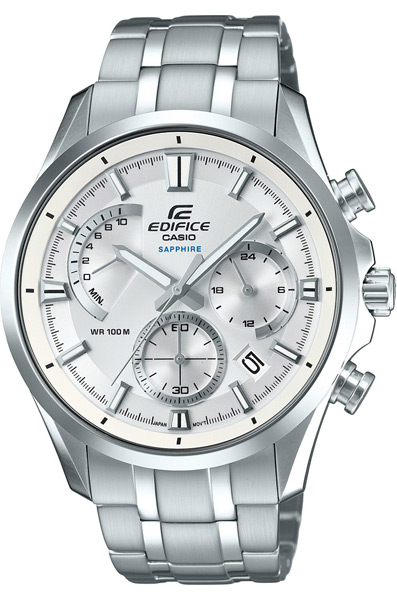 Мужские кварцевые наручные часы с хронографом (секундомером) Casio EFB-550D-7A с сапфировым стеклом. Коллекция Edifice. Калибр механизма — 5490. На данной модели отображается дата и время суток (24 часа). Секундомер может отсчитывать до 9 минут 59 секунд. Стрелки и метки покрыты люминесцентным напылением (светятся в темноте). Водонепроницаемость WR100 (10 атм). Завинчивающаяся задняя крышка.