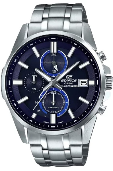 Мужские кварцевые наручные часы с хронографом (секундомером) Casio EFB-560SBD-2A на солнечной батарее. Коллекция Edifice. Калибр механизма — 5529. Срок работы аккумулятора с полным зарядом — около 5-ти месяцев. Примерный срок службы аккумулятора — 10 лет. Присутствует функция информирования о недостаточном заряде и индикатор степени заряда аккумулятора. На данной модели отображается дата и время суток (24 часа). Секундомер может отсчитывать до 29 минут 59 секунд. Стрелки и метки покрыты люминесцентным напылением (светятся в темноте). Сапфировое стекло. Водонепроницаемость WR100 (10 атм). Завинчивающаяся задняя крышка.