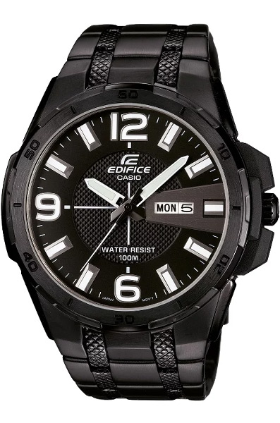 Мужские кварцевые наручные часы Casio EFR-104BK-1A коллекции Edifice. Калибр механизма — 5339. На данной модели отображается дата и день недели. Стрелки и метки покрыты люминесцентным напылением (светятся в темноте). На корпус и браслет нанесено стойкое PVD покрытие. Водонепроницаемость WR100 (10 атм). Завинчивающаяся задняя крышка.