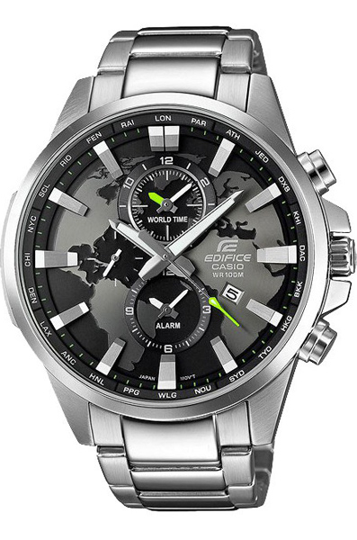 Мужские кварцевые наручные часы c функциями мирового времени и будильника Casio EFR-303D-1A коллекции Edifice. Калибр механизма — 5468. Мировое время в 24-х городах. Будильник может быть установлен в течение ближайших 12 часов. На данной модели отображается дата. Стрелки и метки покрыты люминесцентным напылением (светятся в темноте). Завинчивающаяся задняя крышка часов. Водонепроницаемость WR100 (10 атм).