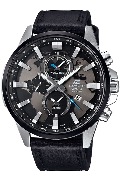 Мужские кварцевые наручные часы c функциями мирового времени и будильника Casio EFR-303L-1A коллекции Edifice. Калибр механизма — 5468. Мировое время в 24-х городах. Будильник может быть установлен в течение ближайших 12 часов. На данной модели отображается дата. Стрелки и метки покрыты люминесцентным напылением (светятся в темноте). Завинчивающаяся задняя крышка часов. Водонепроницаемость WR100 (10 атм).