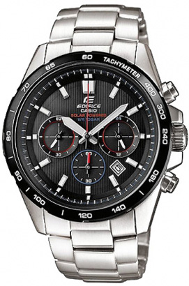 Мужские кварцевые наручные часы с хронографом (секундомером) на солнечной батарее Casio EFR-518SB-1A коллекции Edifice. Калибр механизма — 5274. На данной модели отображается дата и время суток (24-х часовая шкала). Секундомер может отсчитывать до 59 минут 59 сек., так же на циферблате часов присутствует шкала тахиметра для измерения средней скорости движения. Стрелки и метки покрыты люминесцентным напылением (светятся в темноте). Водонепроницаемость WR100 (10 атм). Завинчивающаяся задняя крышка.