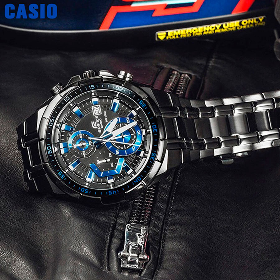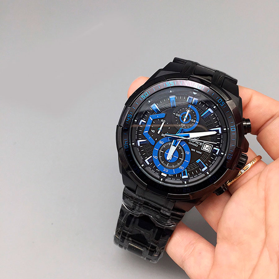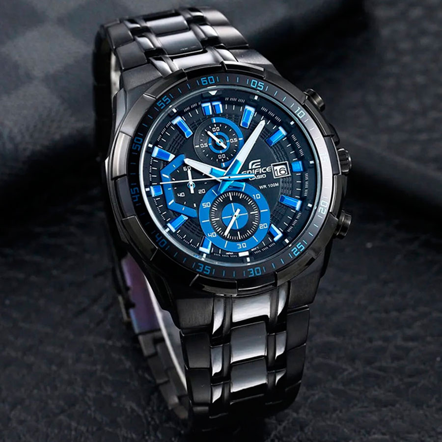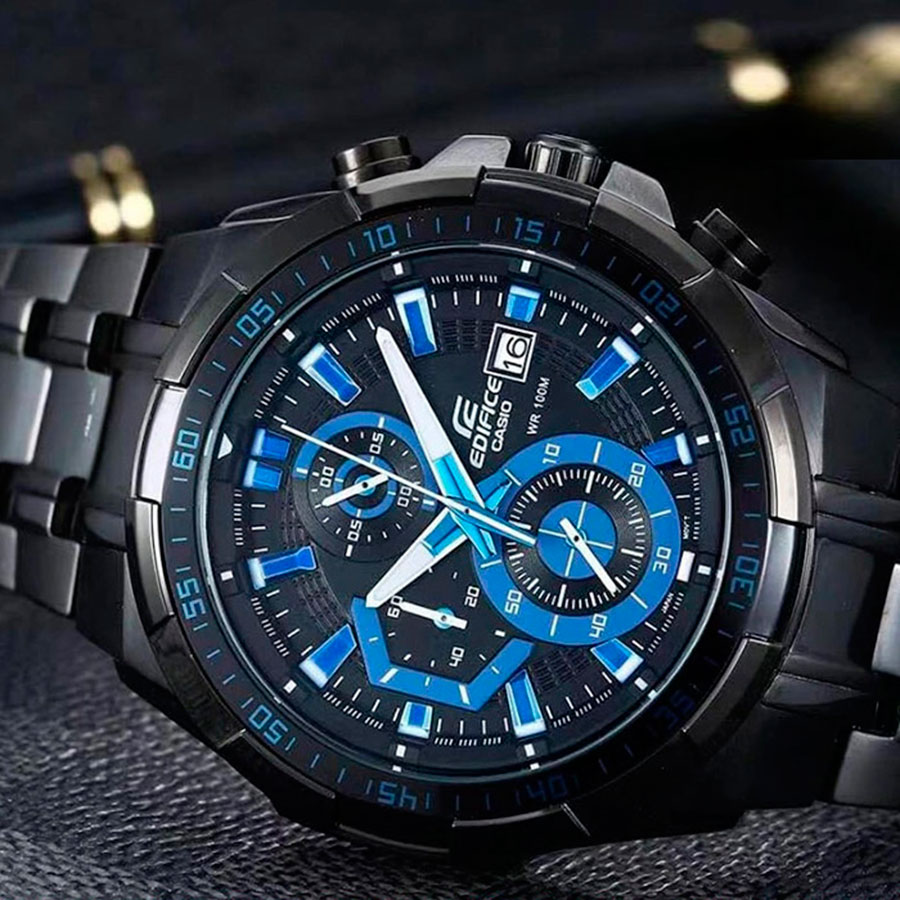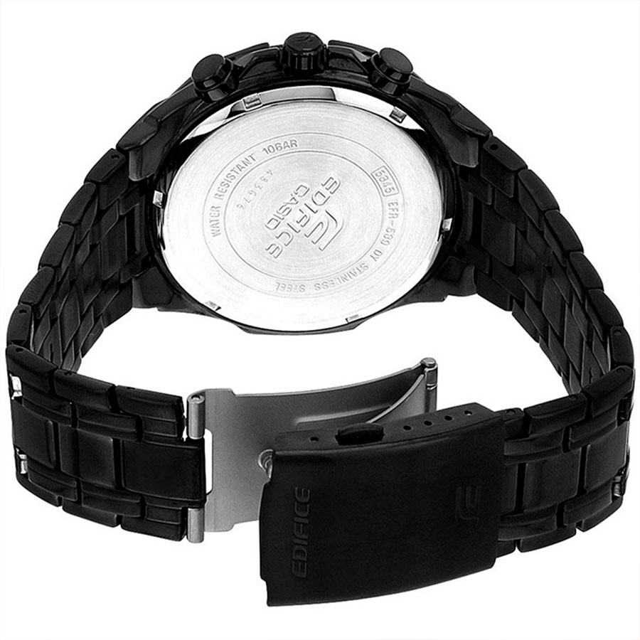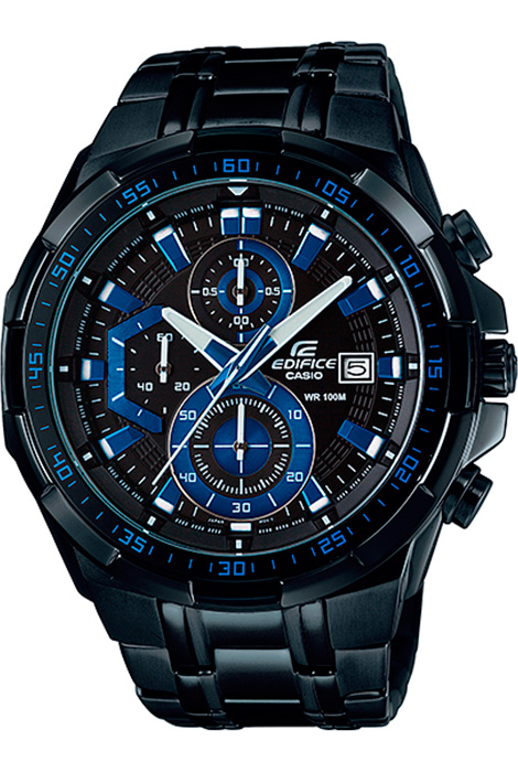 Мужские кварцевые наручные часы с хронографом (секундомером) Casio EFR-539BK-1A2 коллекции Edifice. Калибр механизма — 5345. На данной модели отображается дата. Секундомер может отсчитывать до 59 минут 59 секунд с шагом 1/10 сек. Стрелки и метки покрыты люминесцентным напылением (светятся в темноте). Завинчивающаяся задняя крышка. На корпус и браслет нанесено стойкое PVD покрытие. Водонепроницаемость WR100 (10 атм). Размеры корпуса: (ШхВхТ) 49.5x54.1x11.7 мм Гарантийный срок — 3 года (1 год от производителя + 2 года от магазина).
