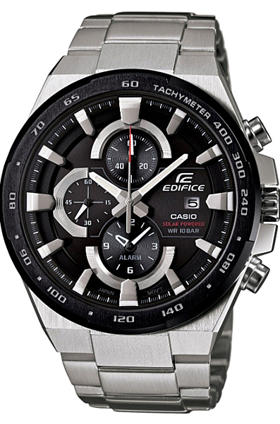 Мужские кварцевые наручные часы с хронографом (секундомером) и будильником на солнечной батарее Casio EFR-541SBDB-1A коллекции Edifice. Калибр механизма — 5273. Аккумулятор данной модели заряжается от любого источника света. Срок работы аккумулятора с полным зарядом — около 6-ти месяцев. Примерный срок службы аккумулятора — 10 лет. На данной модели отображается дата. Секундомер может отсчитывать до 59 минут 59 секунд с шагом 1/5 секунды. Так же на циферблате часов присутствует шкала тахиметра для измерения средней скорости движения. Будильник может быть установлен в течение ближайших 12 часов. Стрелки и метки покрыты люминесцентным напылением (светятся в темноте). Водонепроницаемость WR100 (10 атм). Завинчивающаяся задняя крышка для более уверенной водонепроницаемости часов.