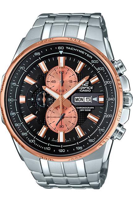 Мужские кварцевые наручные часы с хронографом (секундомером) Casio EFR-549D-1B9 коллекции Edifice. Калибр механизма — 5226. На данной модели отображается дата и день недели. Секундомер может отсчитывать до 11 часов 59 минут 59 секунд, так же на циферблате часов присутствует шкала тахиметра для измерения средней скорости движения. Стрелки и метки покрыты люминесцентным напылением (светятся в темноте). Водонепроницаемость WR100 (10 атм). Завинчивающаяся задняя крышка.