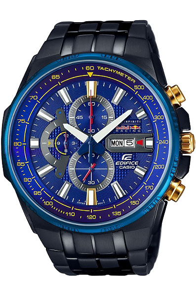 Мужские кварцевые наручные часы с хронографом (секундомером) Casio EFR-549RBB-2A коллекции Edifice. Серия RedBull. Калибр механизма — 5226. На данной модели отображается дата и день недели. Секундомер может отсчитывать до 11 часов 59 минут 59 секунд, так же на циферблате часов присутствует шкала тахиметра для измерения средней скорости движения. Стрелки и метки покрыты люминесцентным напылением (светятся в темноте). Водонепроницаемость WR100 (10 атм). Завинчивающаяся задняя крышка.