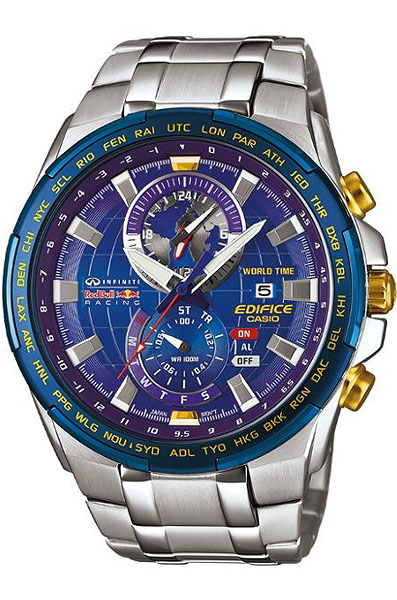 Мужские кварцевые наручные часы c функциями мирового времени, будильника, секундомера и таймера Casio EFR-550RB-2A коллекции Edifice. Серия RedBull. Калибр механизма — 5406. Мировое время в 29 городах. Будильник может быть установлен в течение ближайших 12 часов. Секундомер с измерением до 23 часов 59 минут 59,95 cек., таймер обратного отсчета (диапазон времени 24 часов). На данной модели отображается дата и день недели. Стрелки и метки покрыты люминесцентным напылением (светятся в темноте). Завинчивающаяся задняя крышка часов. Водонепроницаемость WR100 (10 атм).