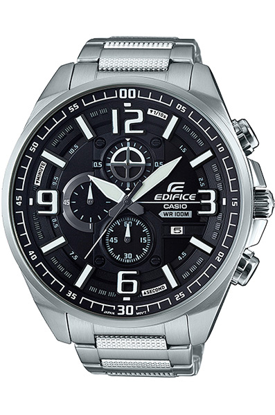 Мужские кварцевые наручные часы с хронографом (секундомером) Casio EFR-555D-1A коллекции Edifice. Калибр механизма — 5517. На данной модели отображается дата. Секундомер может отсчитывать до 59 минут 59 секунд с шагом 1/10 сек. Стрелки и метки покрыты люминесцентным напылением (светятся в темноте). Водонепроницаемость WR100 (10 атм). Завинчивающаяся задняя крышка.