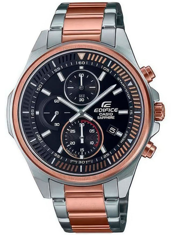 Мужские кварцевые наручные часы с хронографом (секундомером) Casio EFR-S572GS-1A. Коллекция Edifice. Тонкий корпус — 9.1 мм. Калибр механизма — 5619. На данной модели отображается дата. Секундомер может отсчитывать до 29 минут 59 секунд с шагом 1 сек. Стрелки и метки покрыты люминесцентным напылением (светятся в темноте). Установлено сапфировое стекло устойчивое к царапинам. На корпус и браслет частично нанесено стойкое PVD покрытие. Водонепроницаемость WR100 (10 атм). Размеры корпуса: (ШxВxТ) 44.7x49.3x9.1 мм. Гарантийный срок — 3 года (1 год от производителя + 2 года от магазина).