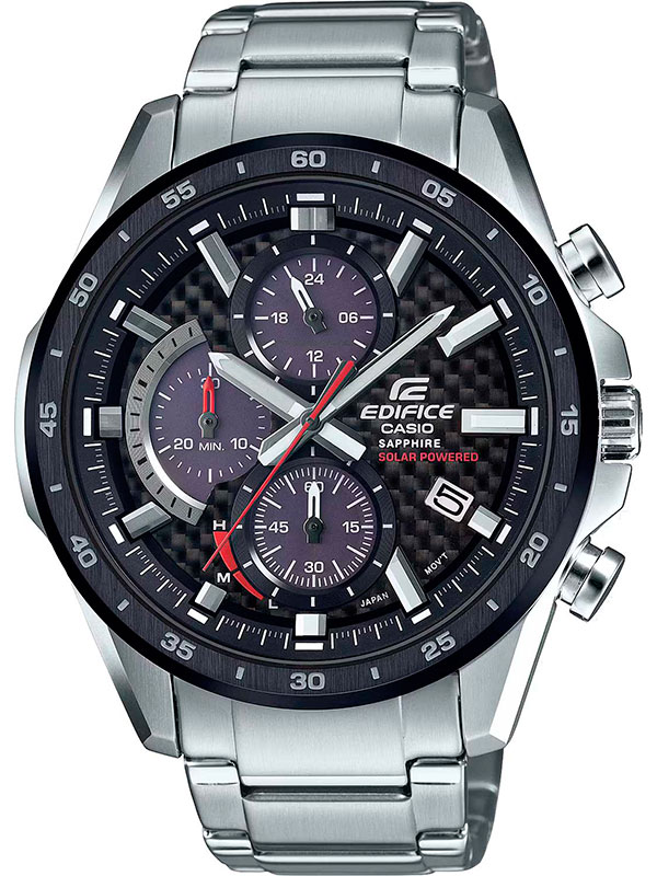 Мужские кварцевые наручные часы с хронографом (секундомером) Casio EFS-S540DB-1A на солнечной батарее. Коллекция Edifice. Калибр механизма — 5587. Срок работы аккумулятора с полным зарядом — около 5-ти месяцев. Примерный срок службы аккумулятора — 10 лет. Присутствует функция информирования о недостаточном заряде и индикатор степени заряда аккумулятора. На данной модели отображается дата и время суток (24 часа). Секундомер может отсчитывать до 29 минут 59 секунд. Стрелки и метки покрыты люминесцентным напылением (светятся в темноте). На корпус частично нанесено стойкое PVD покрытие. Установлено сапфировое стекло устойчивое к царапинам. Водонепроницаемость WR100 (10 атм). Завинчивающаяся задняя крышка. Размеры корпуса: (ШхВхТ) 44.2x49.5x11.6 мм Гарантийный срок — 3 года (1 год от производителя + 2 года от магазина).