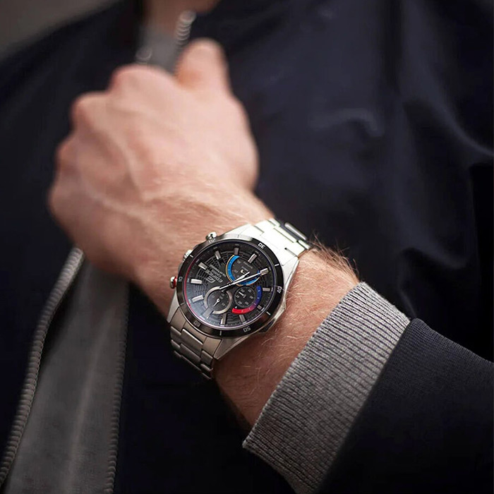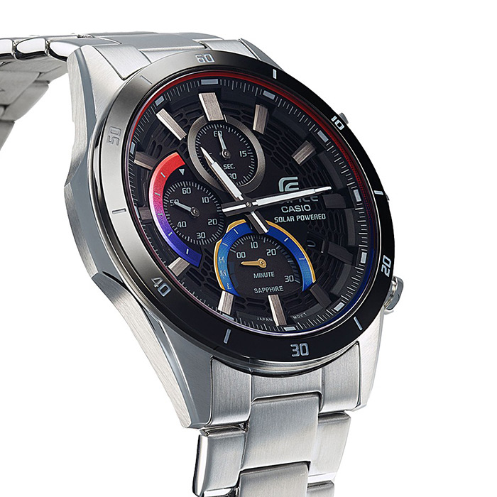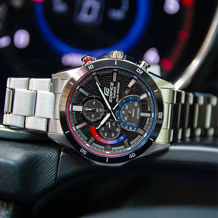Мужские кварцевые наручные часы с хронографом (секундомером) на солнечной батарее Casio EFS-S610HG-1A. Коллекция Edifice. Калибр механизма — 5633. Аккумулятор данной модели заряжается от любого источника света. Срок работы аккумулятора с полным зарядом — около 6-ти месяцев. Примерный срок службы аккумулятора — 10 лет. Имеется индикатор уровня заряда батареи. На данной модели отображается дата. Секундомер может отсчитывать до 29 минут 59 секунд с точностью 1 секунда. Стрелки и метки покрыты люминесцентным напылением (светятся в темноте). Сапфировое стекло с антибликовым покрытием, устойчивое к появлению царапин. Стальной браслет. На корпус частично нанесено стойкое PVD покрытие. Водонепроницаемость WR100 (10 атм). Размеры корпуса: (ШхВхТ) 45.2x50x9.7 мм Гарантийный срок — 3 года (1 год от производителя + 2 года от магазина).