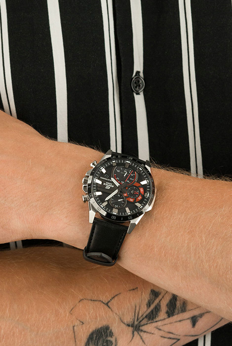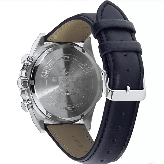Мужские кварцевые наручные часы с хронографом (секундомером) на солнечной батарее Casio EFS-S620BL-1A. Коллекция Edifice. Калибр механизма — 5585. Аккумулятор данной модели заряжается от любого источника света. Срок работы аккумулятора с полным зарядом — около 5-ти месяцев. Примерный срок службы аккумулятора — 10 лет. Имеется индикатор уровня заряда батареи. На данной модели отображается дата и время суток в 24-х часовом формате. Секундомер может отсчитывать до 29 минут 59 секунд с точностью 1 секунда. Стрелки и метки покрыты люминесцентным напылением (светятся в темноте). Сапфировое стекло с антибликовым покрытием, устойчивое к появлению царапин. Завинчивающаяся задняя крышка. Кожаный ремешок. На корпус частично нанесено стойкое PVD покрытие. Водонепроницаемость WR100 (10 атм). Размеры корпуса: (ШхВхТ) 45.5x49.5x12.2 мм Гарантийный срок — 3 года (1 год от производителя + 2 года от магазина).