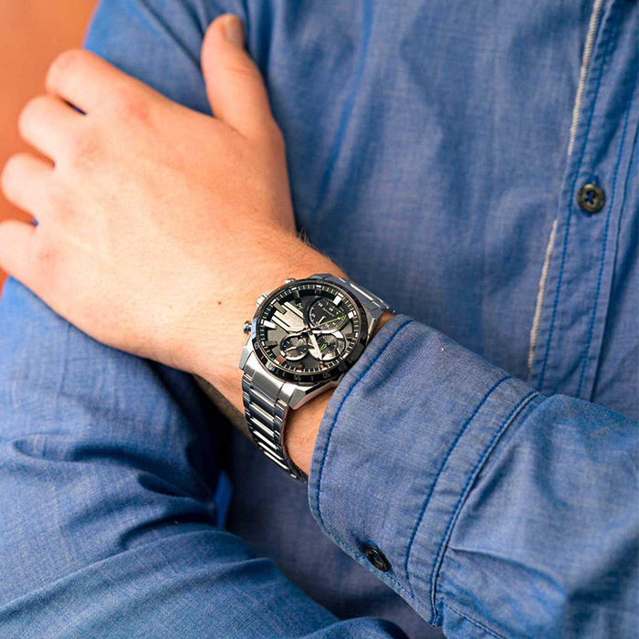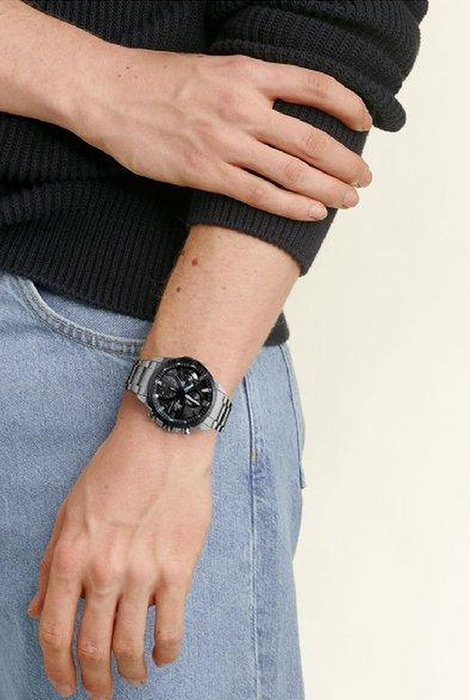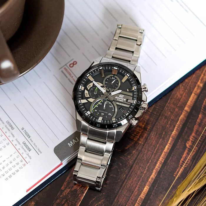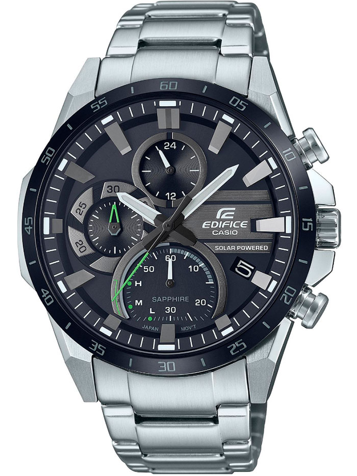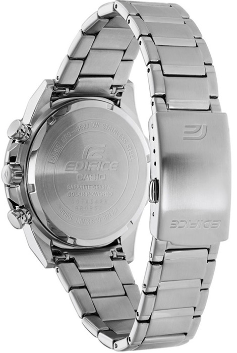 Мужские кварцевые наручные часы с хронографом (секундомером) на солнечной батарее Casio EFS-S620DB-1A. Коллекция Edifice. Калибр механизма — 5585. Аккумулятор данной модели заряжается от любого источника света. Срок работы аккумулятора с полным зарядом — около 5-ти месяцев. Примерный срок службы аккумулятора — 10 лет. Имеется индикатор уровня заряда батареи. На данной модели отображается дата и время суток в 24-х часовом формате. Секундомер может отсчитывать до 29 минут 59 секунд с точностью 1 секунда. Стрелки и метки покрыты люминесцентным напылением (светятся в темноте). Сапфировое стекло с антибликовым покрытием, устойчивое к появлению царапин. Завинчивающаяся задняя крышка. Стальной браслет. На корпус частично нанесено стойкое PVD покрытие. Водонепроницаемость WR100 (10 атм). Размеры корпуса: (ШхВхТ) 45.5x49.5x12.2 мм Гарантийный срок — 3 года (1 год от производителя + 2 года от магазина).