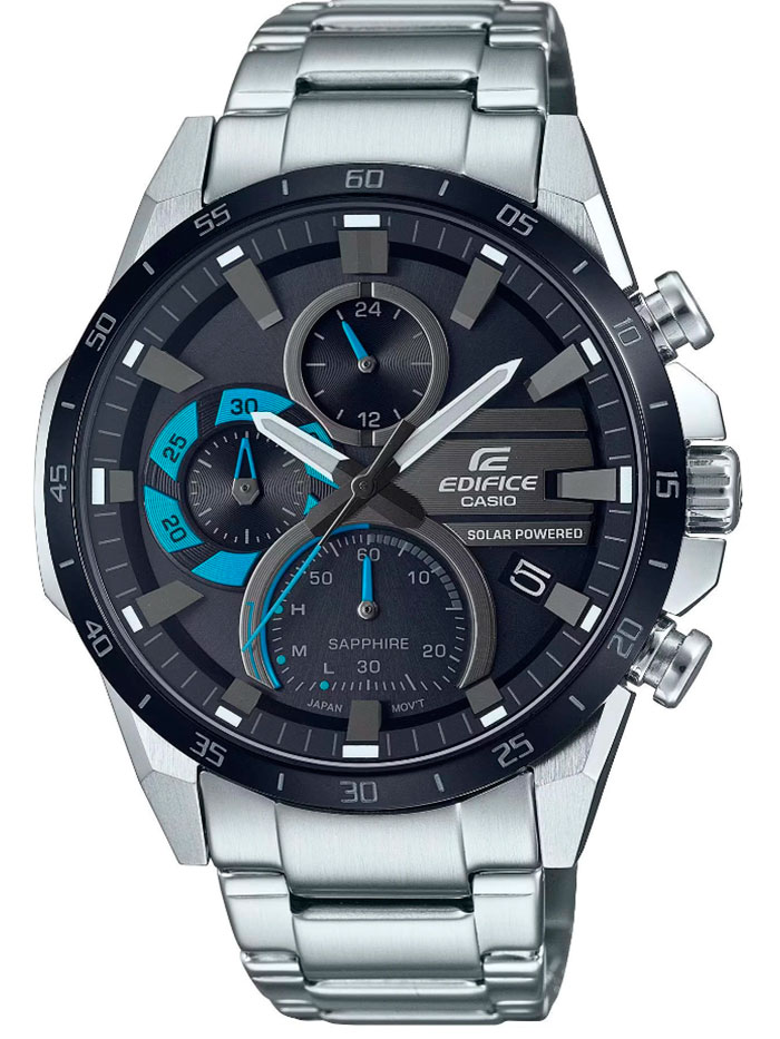 Мужские кварцевые наручные часы с хронографом (секундомером) на солнечной батарее Casio EFS-S620DB-1B. Коллекция Edifice. Калибр механизма — 5585. Аккумулятор данной модели заряжается от любого источника света. Срок работы аккумулятора с полным зарядом — около 5-ти месяцев. Примерный срок службы аккумулятора — 10 лет. Имеется индикатор уровня заряда батареи. На данной модели отображается дата и время суток в 24-х часовом формате. Секундомер может отсчитывать до 29 минут 59 секунд с точностью 1 секунда. Стрелки и метки покрыты люминесцентным напылением (светятся в темноте). Сапфировое стекло с антибликовым покрытием, устойчивое к появлению царапин. Завинчивающаяся задняя крышка. Стальной браслет. На корпус частично нанесено стойкое PVD покрытие. Водонепроницаемость WR100 (10 атм). Размеры корпуса: (ШхВхТ) 45.5x49.5x12.2 мм Гарантийный срок — 3 года (1 год от производителя + 2 года от магазина).